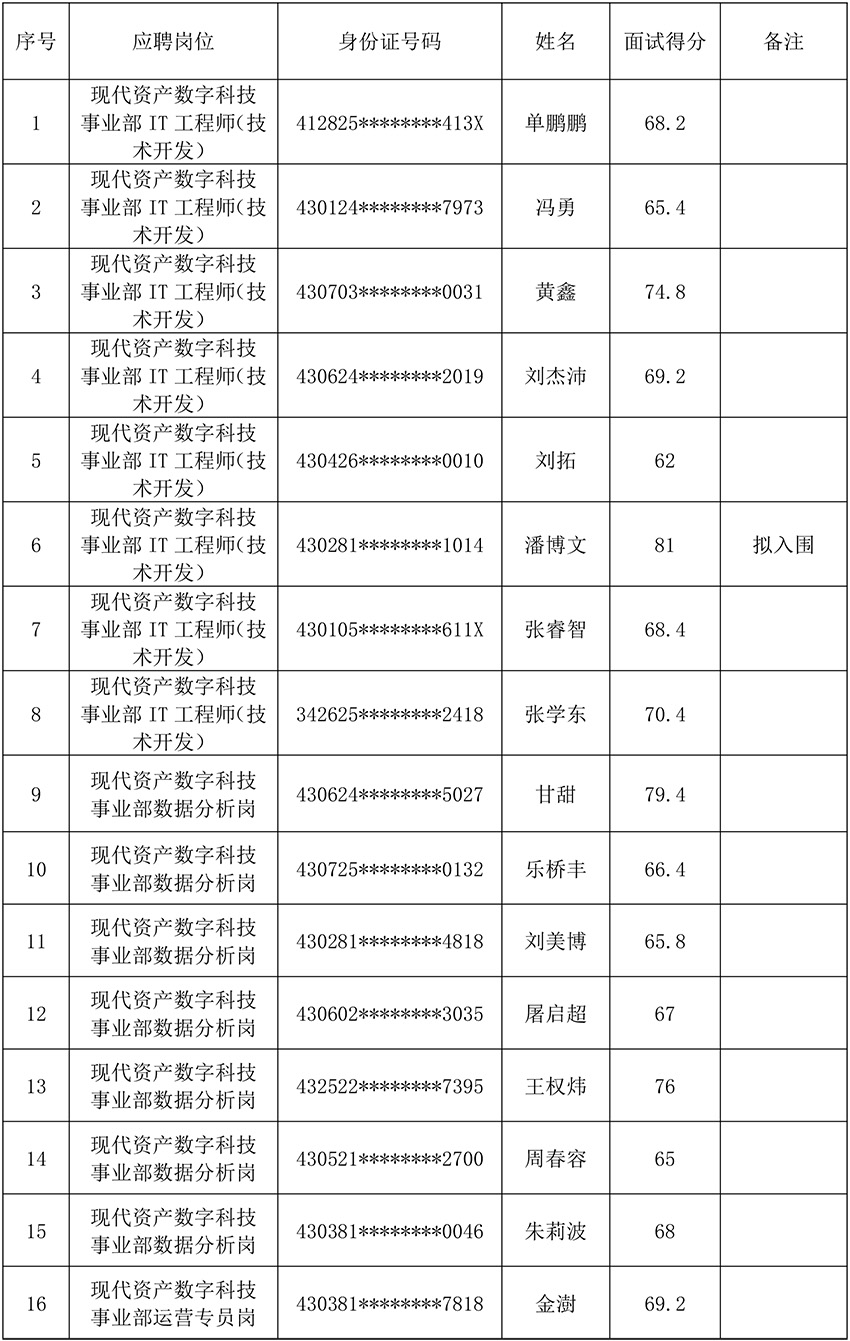湖南现代资产经营有限公司2025年公开招聘部分岗位面试已完成,现将成绩予以公示。